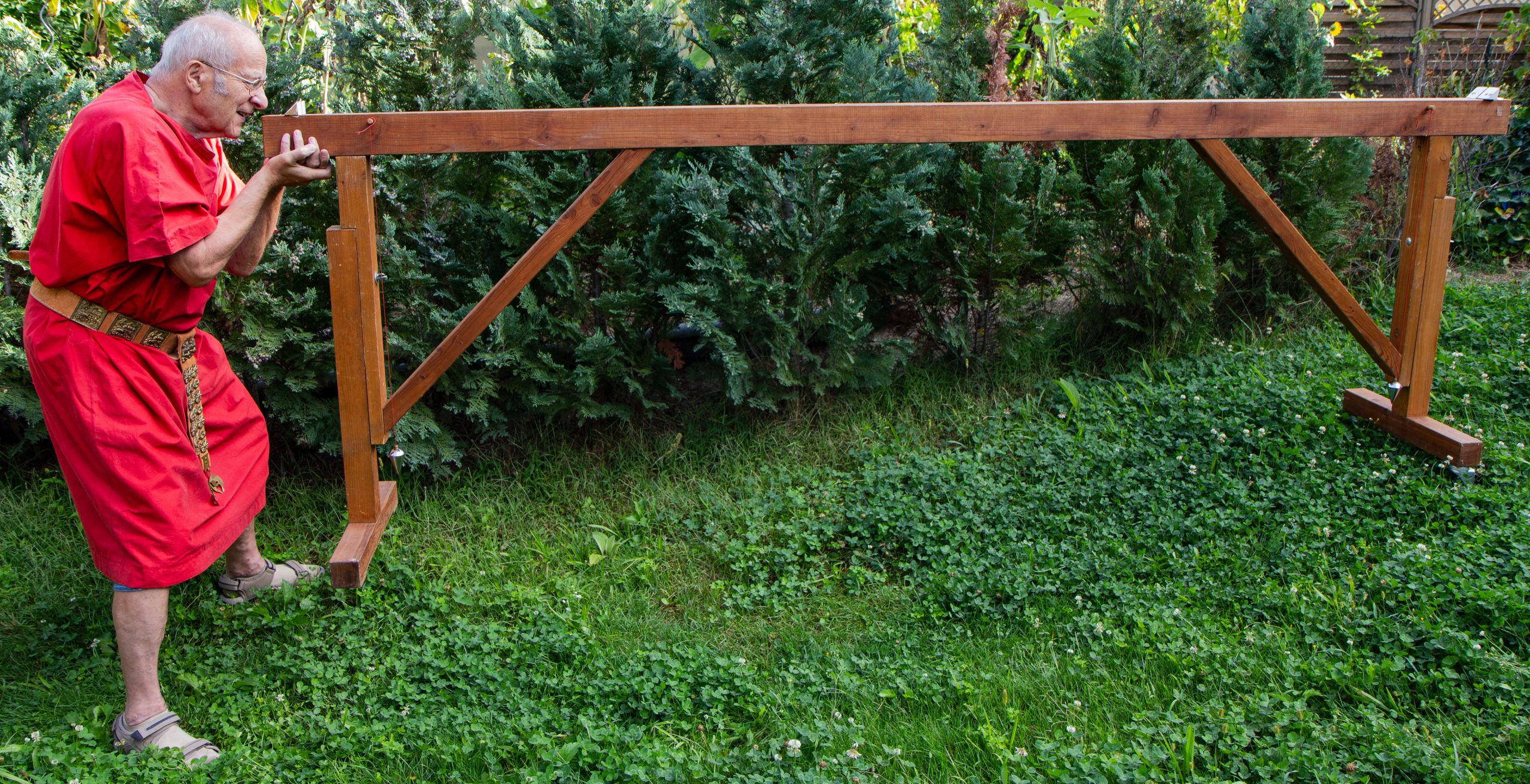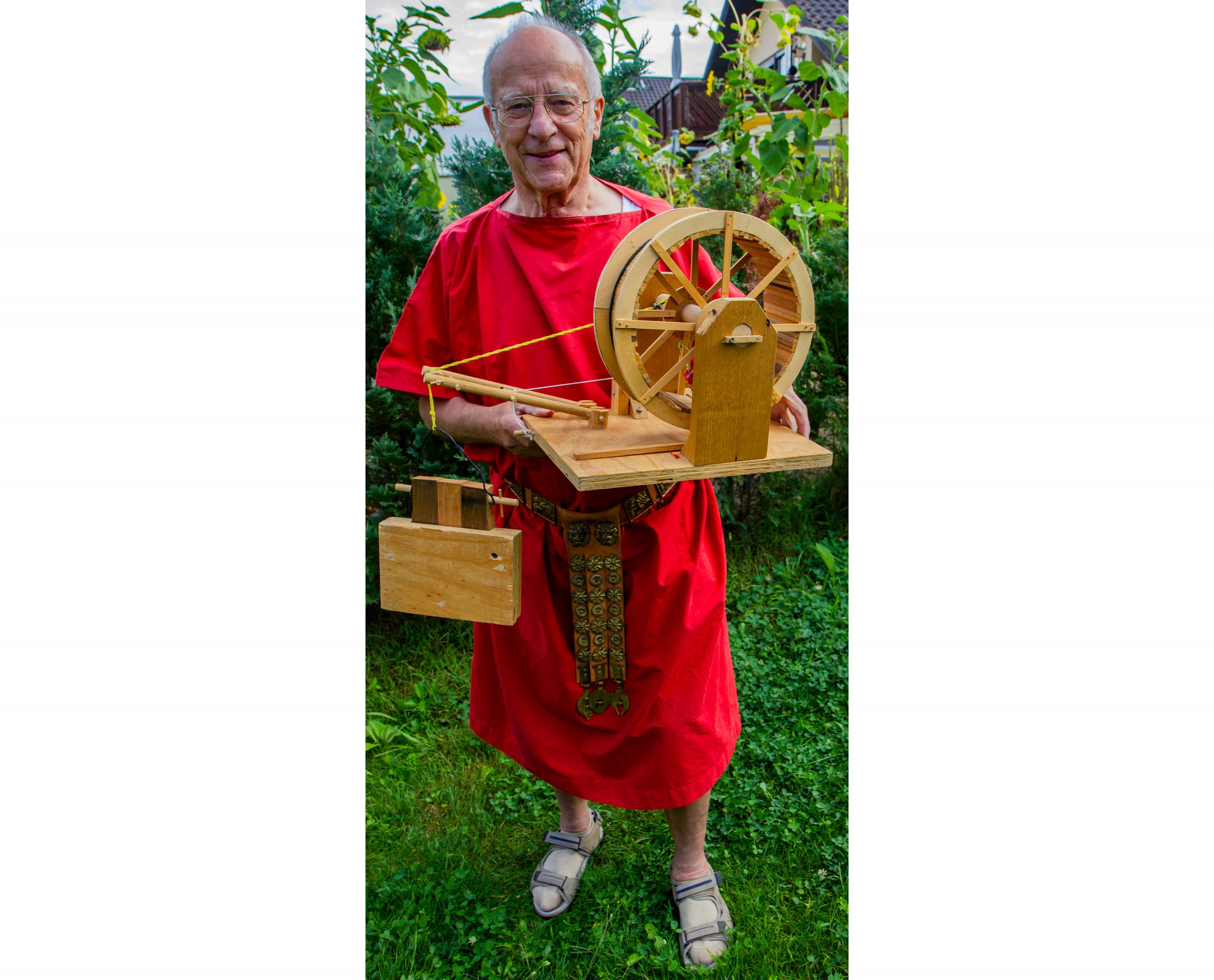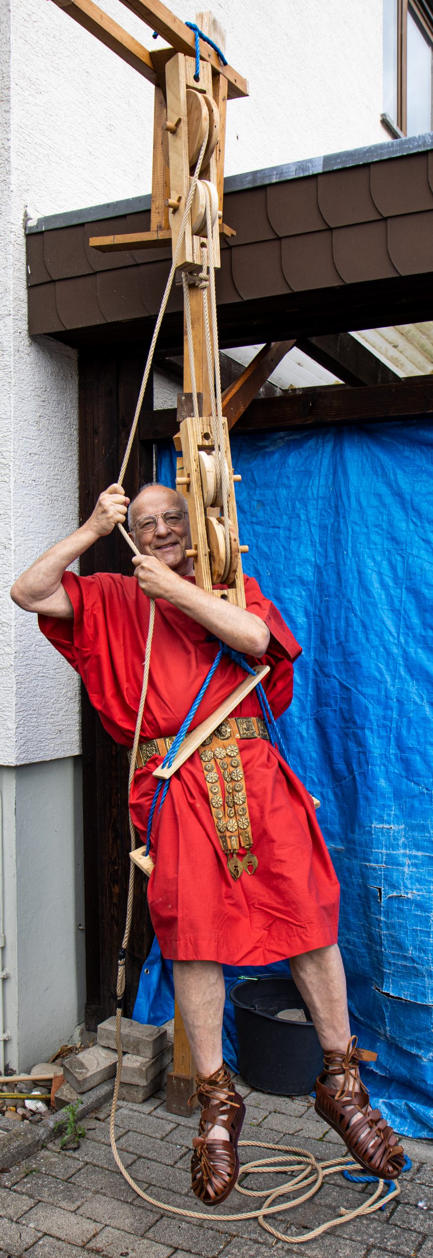 Mit dem von Rainer Brand und Lothar Weis auf- und abbaubaren Tretradkran können bei einem Raddurchmesser von 2m und einem Achsendurchmesser von 20cm schwere Lasten im Verhältnis 1:10 hochgezogen werden.