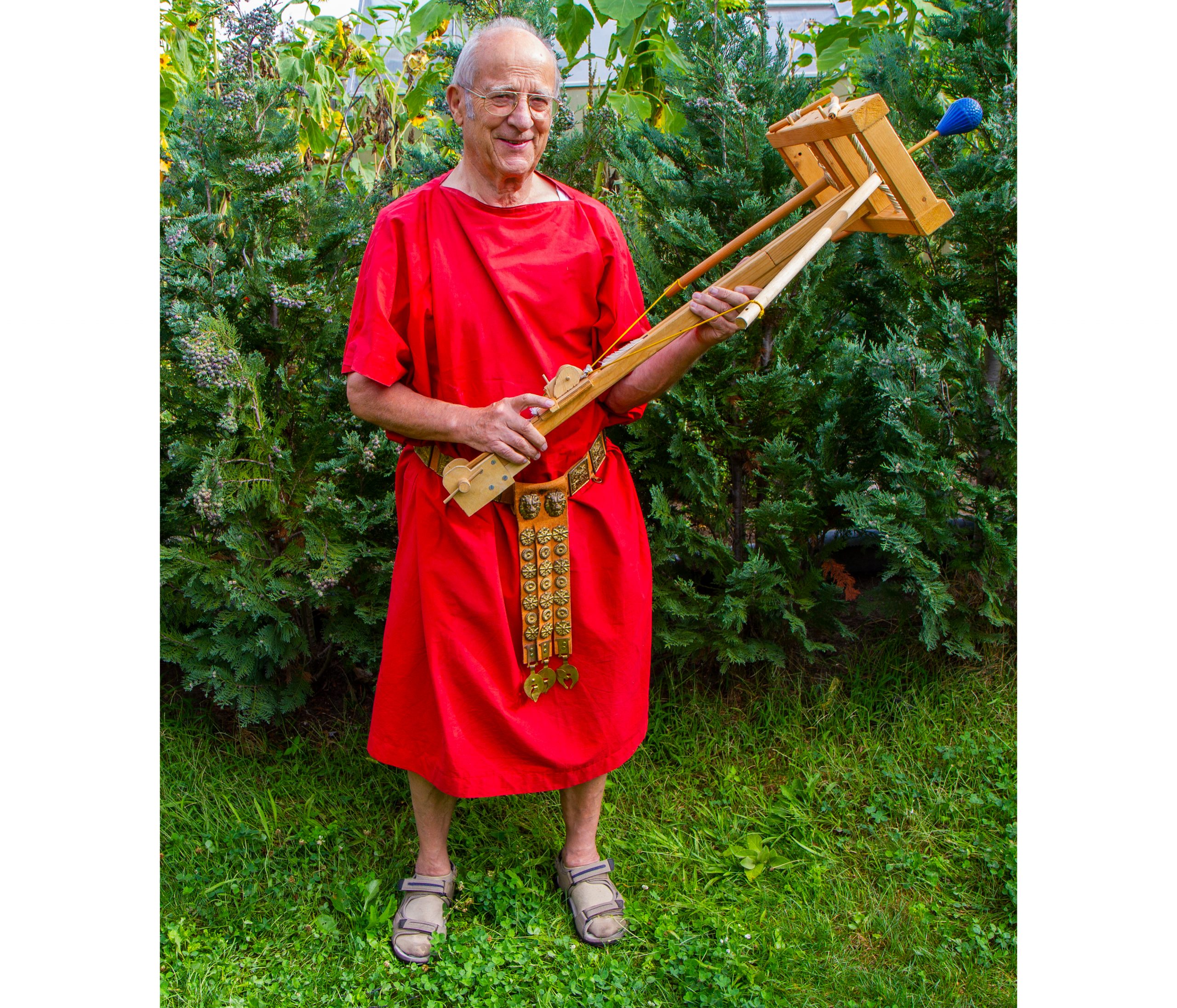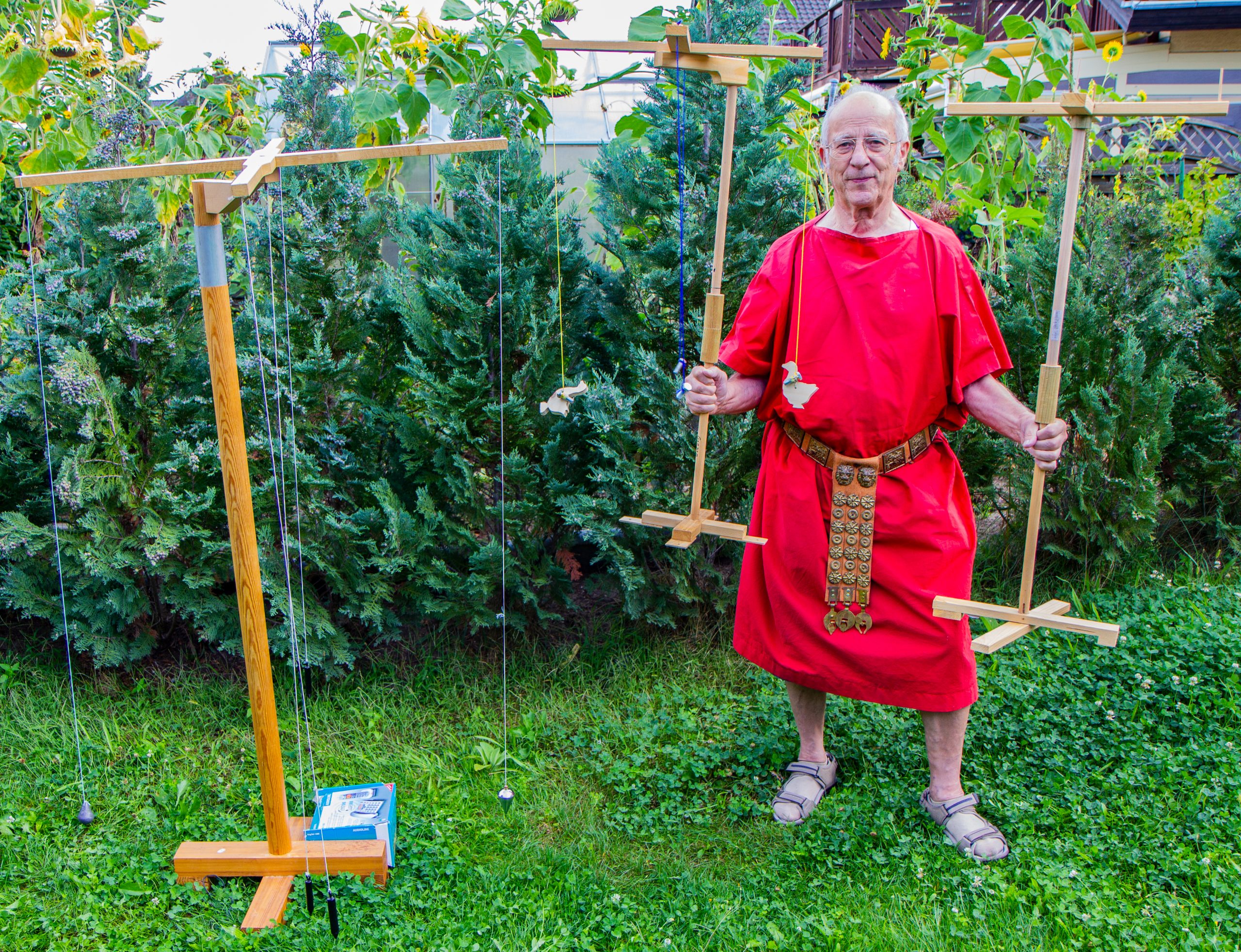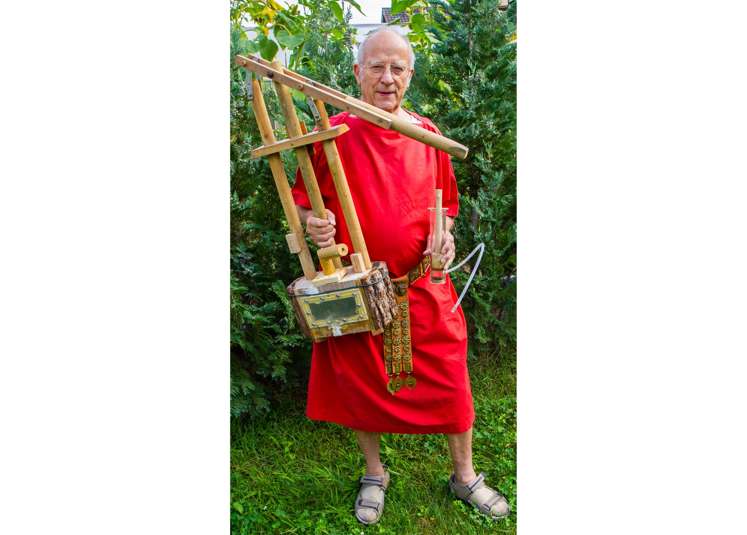 Mit dem von Rainer Brand und Lothar Weis auf- und abbaubaren Tretradkran können bei einem Raddurchmesser von 2m und einem Achsendurchmesser von 20cm schwere Lasten im Verhältnis 1:10 hochgezogen werden.