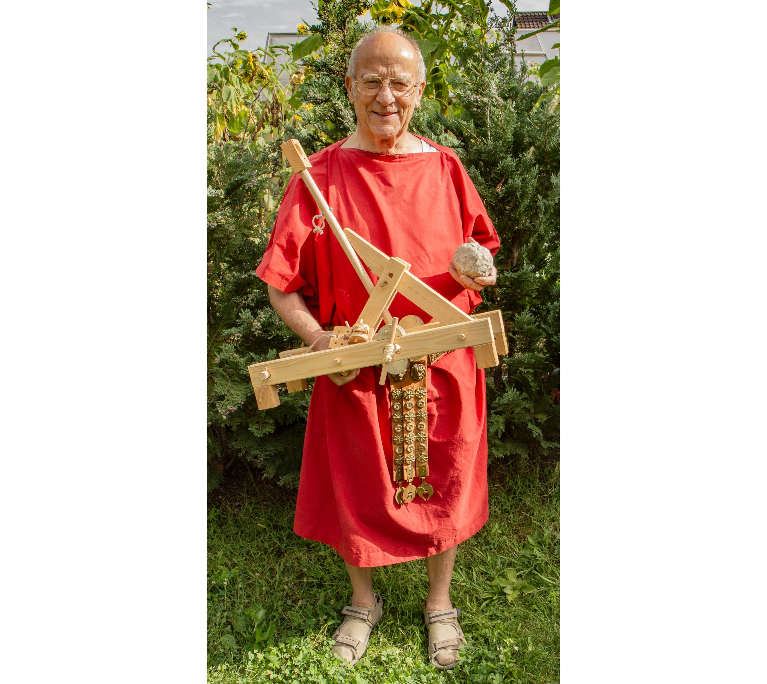 In der linken Hand hält Lothar Weis eine echte Steinkugel mit einem Gewicht von 1kg und einem Durchmesser von 9cm.